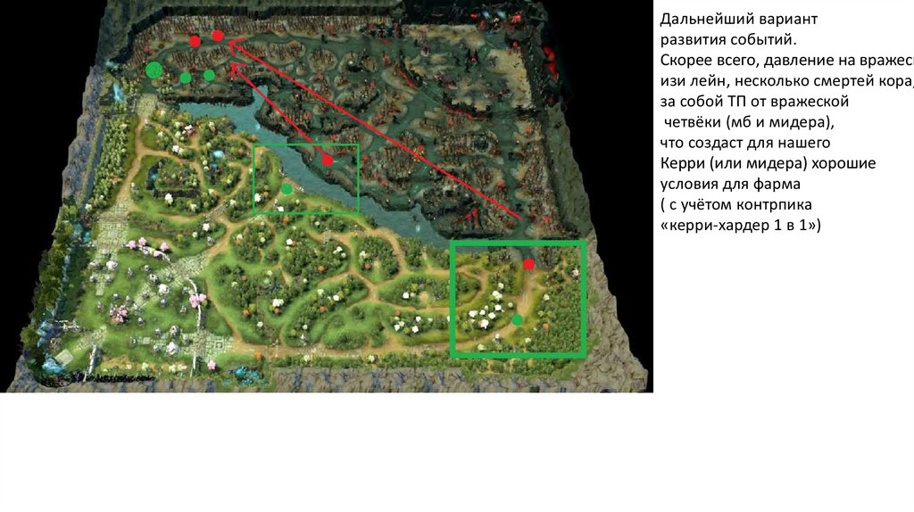 Работаем против вражеского керри и мида. Оказываем давление на вражеский изи лейн и мид.