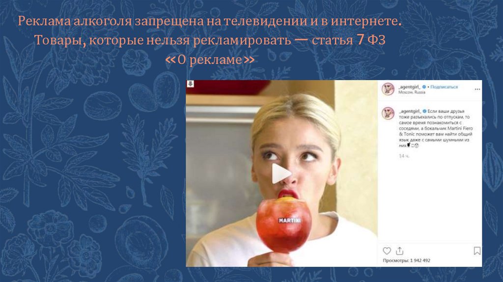 Реклама алкоголя запрещена на телевидении и в интернете.Товары, которые нельзя рекламировать — статья 7 ФЗ