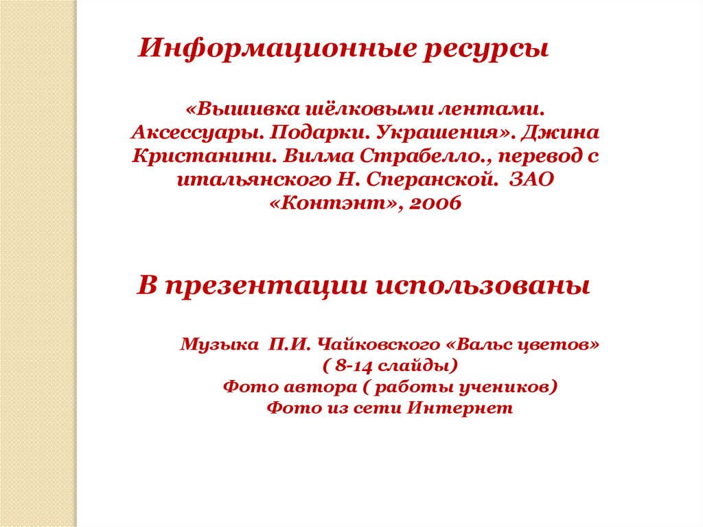 Информационные ресурсы«Вышивка шёлковыми лентами.