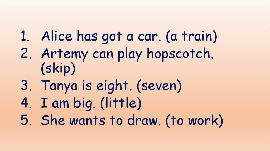 1. Alice has got a car. (a train)2. Artemy can play hopscotch.