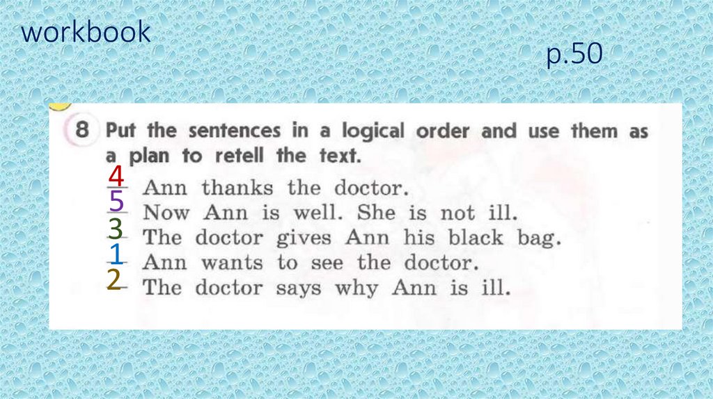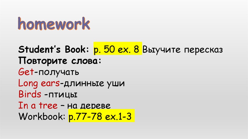Student’s Book: p. 50 ex. 8 Выучите пересказПовторите слова: