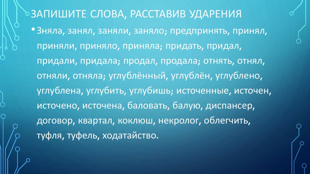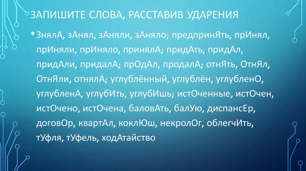 ЗАПИШИТЕ СЛОВА, РАССТАВИВ УДАРЕНИЯ• ЗнялА, зАнял, зАняли, зАняло; предпринЯть, прИнял,