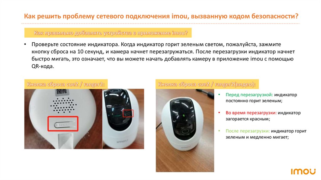 Как решить проблему сетевого подключения imou, вызванную кодом безопасности?• Проверьте состояние индикатора. Когда индикатор горит зеленым светом, пожалуйста, зажмите