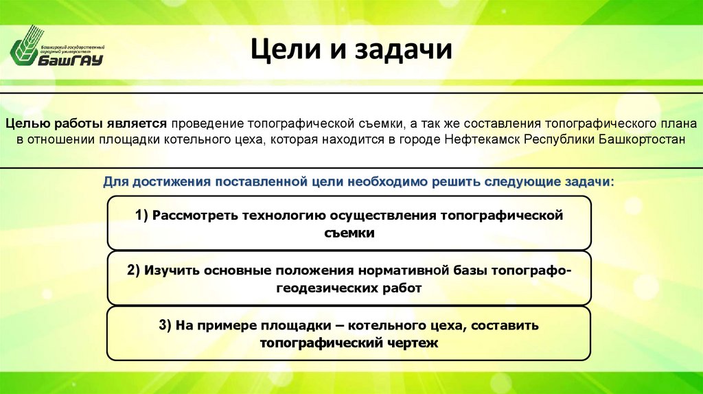 Цели и задачиЦелью работы является проведение топографической съемки, а так же составления топографического плана