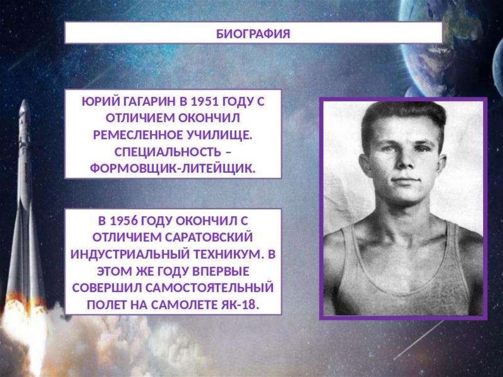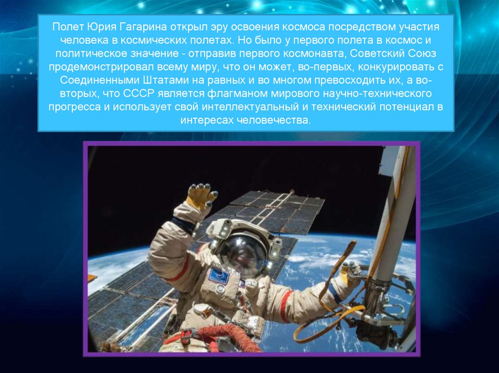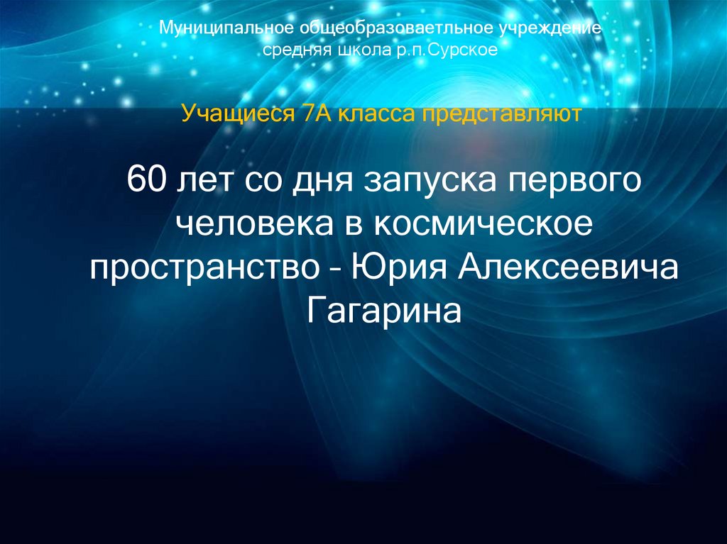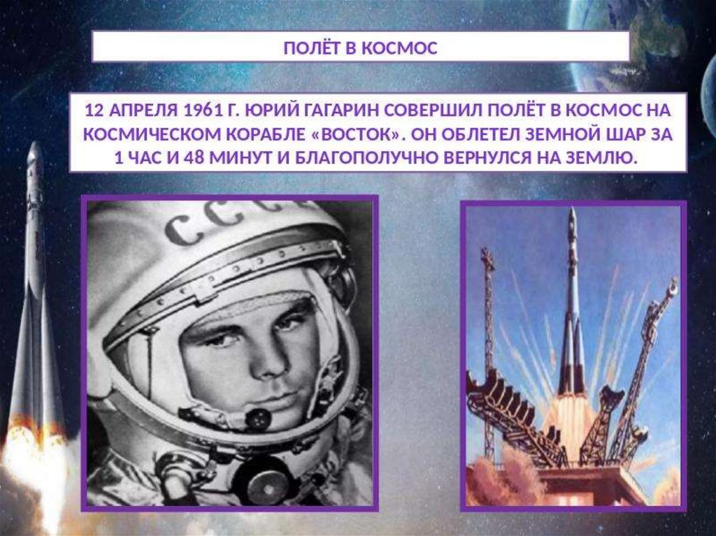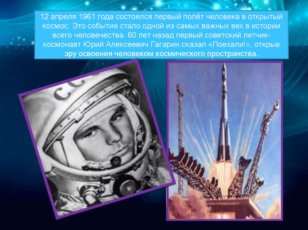 всего человечества. 60 лет назад первый советский летчиккосмонавт Юрий Алексеевич Гагарин сказал «Поехали!», открыв
