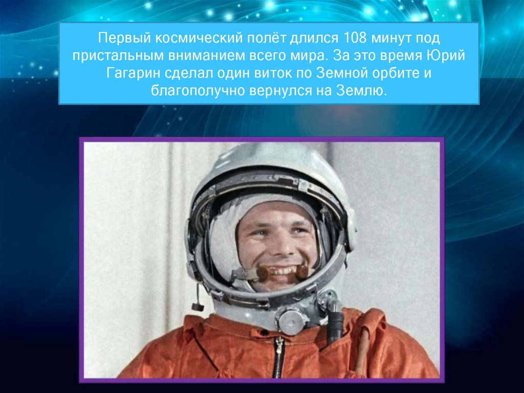 Первый космический полёт длился 108 минут подпристальным вниманием всего мира. За это время Юрий