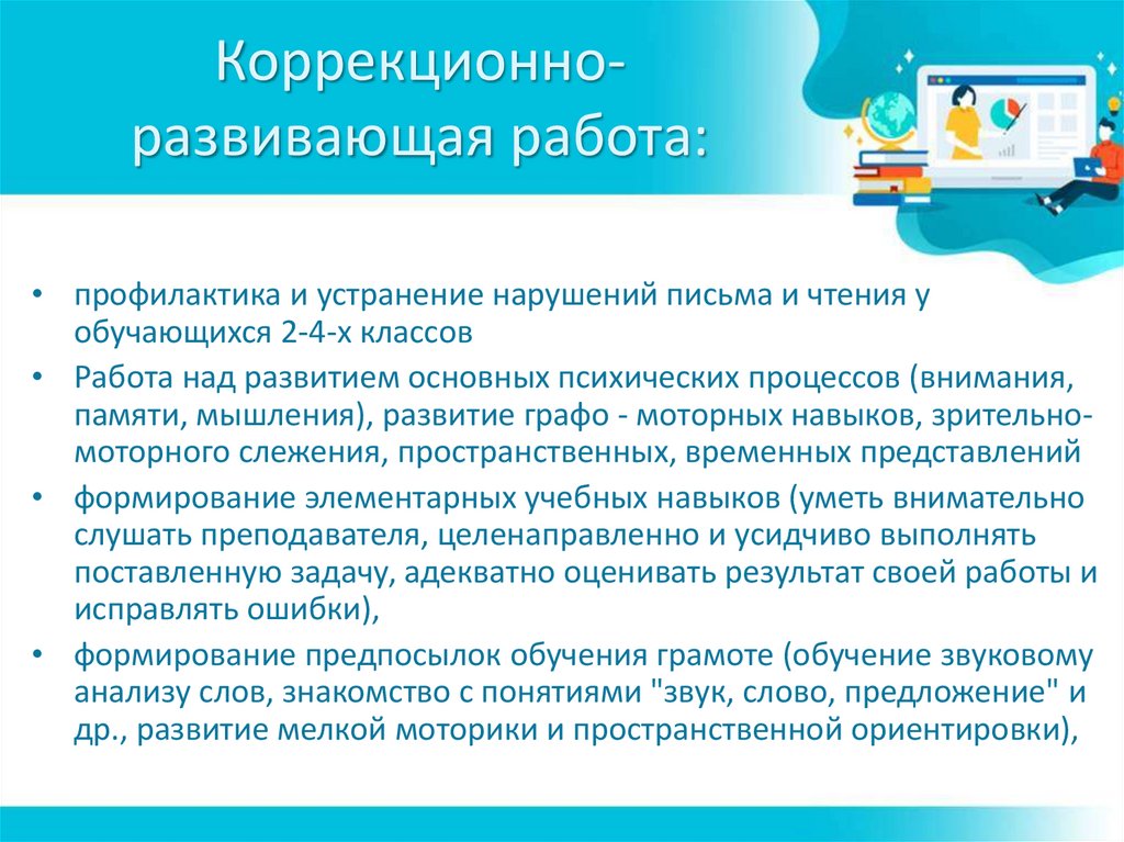 Коррекционноразвивающая работа:• профилактика и устранение нарушений письма и чтения у
