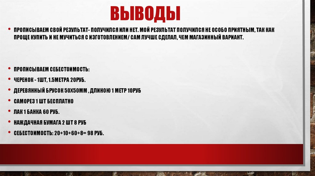 ВЫВОДЫПРОПИСЫВАЕМ СВОЙ РЕЗУЛЬТАТ- ПОЛУЧИЛСЯ ИЛИ НЕТ. МОЙ РЕЗУЛЬТАТ ПОЛУЧИЛСЯ НЕ ОСОБО ПРИЯТНЫМ, ТАК КАК