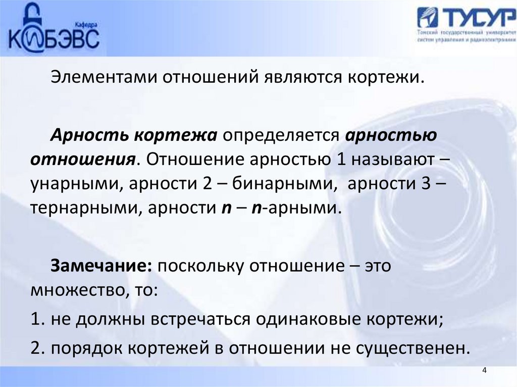 Элементами отношений являются кортежи.Арность кортежа определяется арностью