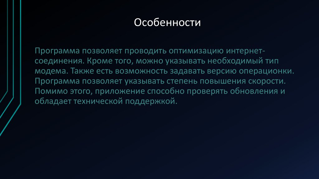 ОсобенностиПрограмма позволяет проводить оптимизацию интернетсоединения. Кроме того, можно указывать необходимый тип