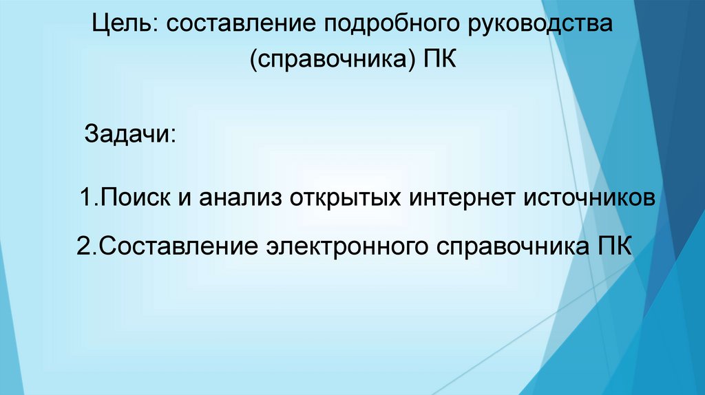 Цель: составление подробного руководства(справочника) ПК