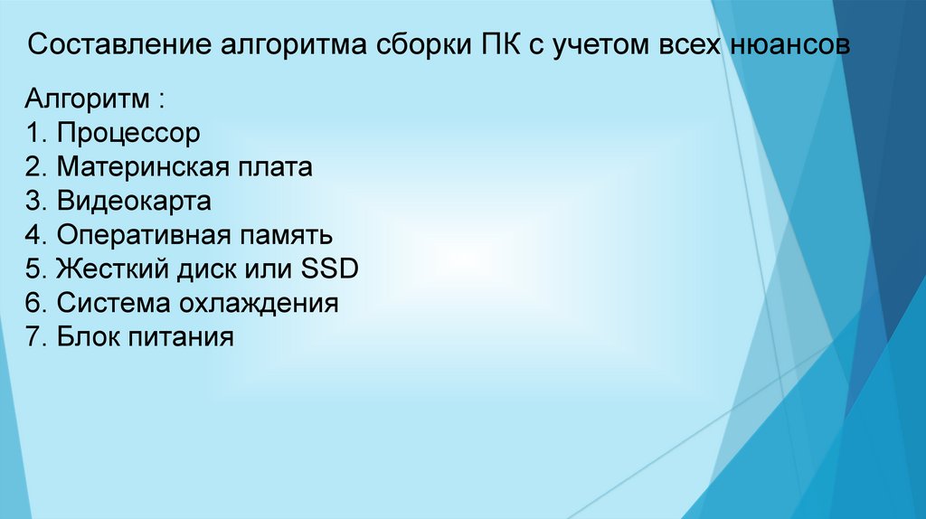 Составление алгоритма сборки ПК с учетом всех нюансовАлгоритм :