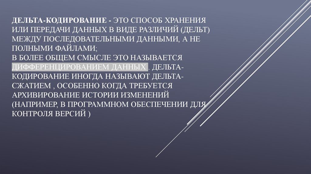 ДЕЛЬТА-КОДИРОВАНИЕ - ЭТО СПОСОБ ХРАНЕНИЯИЛИ ПЕРЕДАЧИ ДАННЫХ В ВИДЕ РАЗЛИЧИЙ (ДЕЛЬТ)