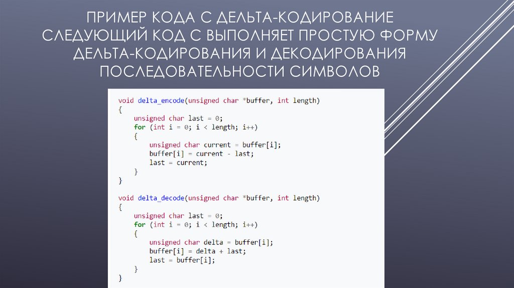 ПРИМЕР КОДА C ДЕЛЬТА-КОДИРОВАНИЕСЛЕДУЮЩИЙ КОД C ВЫПОЛНЯЕТ ПРОСТУЮ ФОРМУ