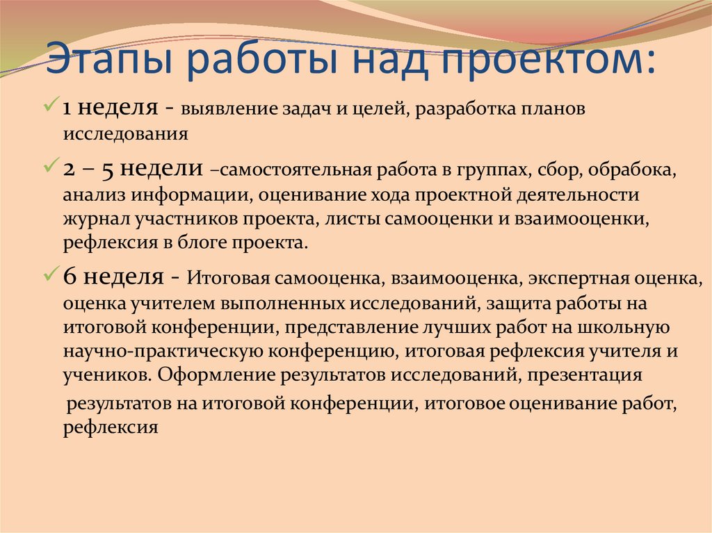 Этапы работы над проектом:1 неделя - выявление задач и целей, разработка планов