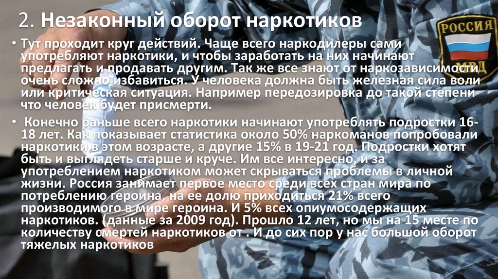 2. Незаконный оборот наркотиков• Тут проходит круг действий. Чаще всего наркодилеры сами