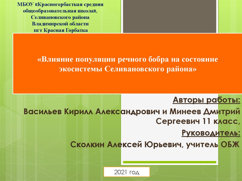 Влияние популяции речного бобра на состояние экосистемы Селивановского района