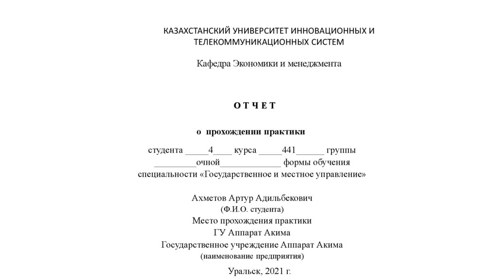 Подготовка отчета о прохождении практики. Составление дневника. ГУ «Аппарат акима»
