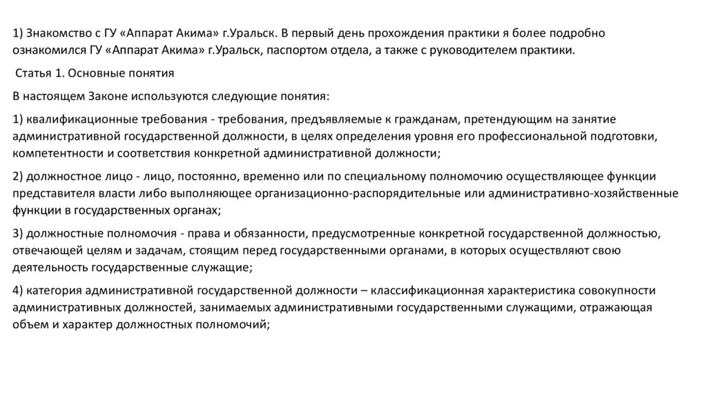 Изучение функциональных обязанностей государственного служащего. Прохождение практики в ГУ Аппарат Акима