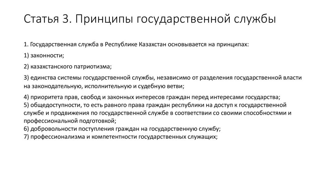 Статья 3. Принципы государственной службы1. Государственная служба в Республике Казахстан основывается на принципах: