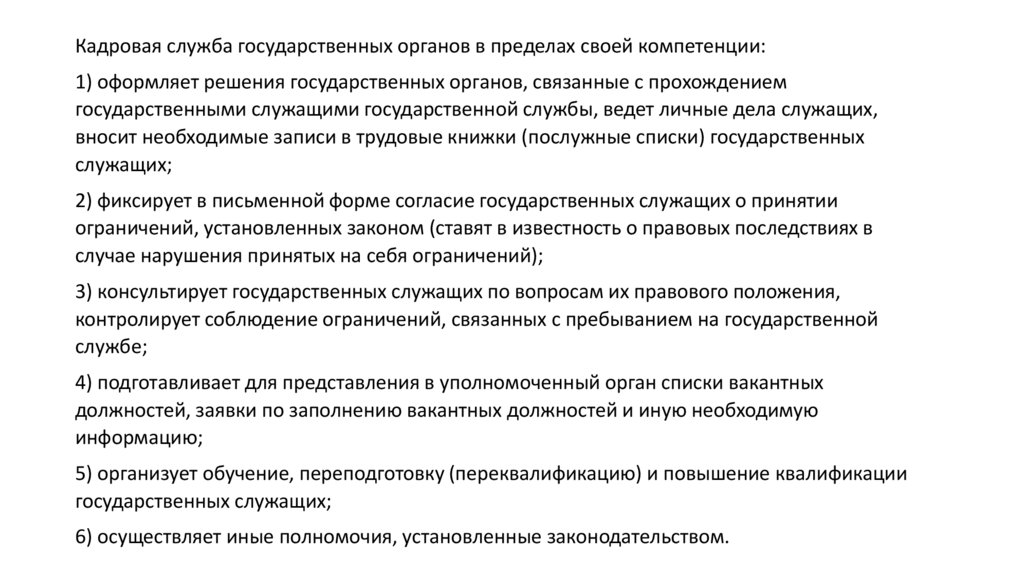 Кадровая служба государственных органов в пределах своей компетенции:1) оформляет решения государственных органов, связанные с прохождением