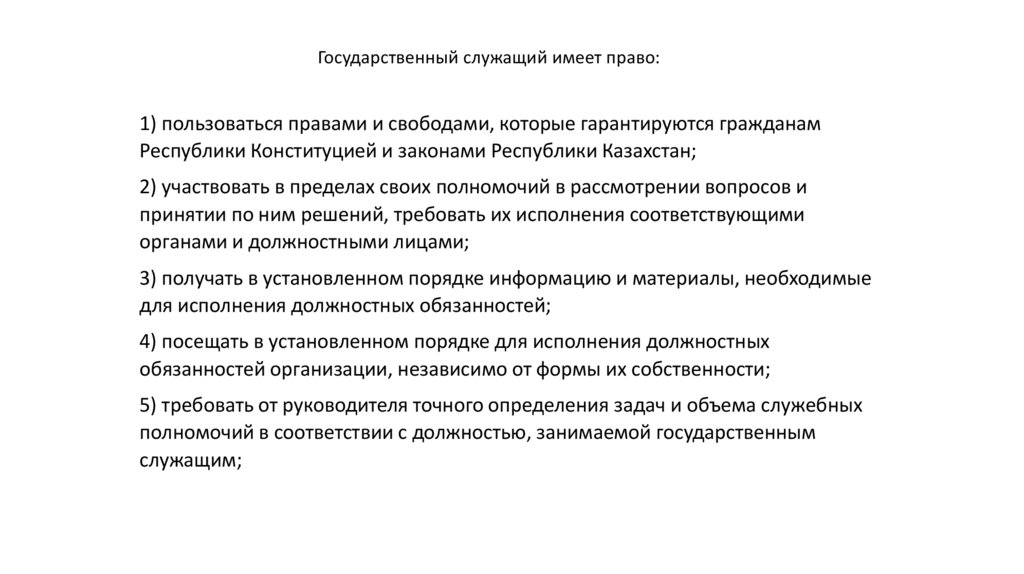 Государственный служащий имеет право:1) пользоваться правами и свободами, которые гарантируются гражданам