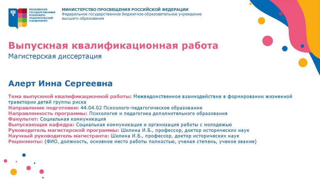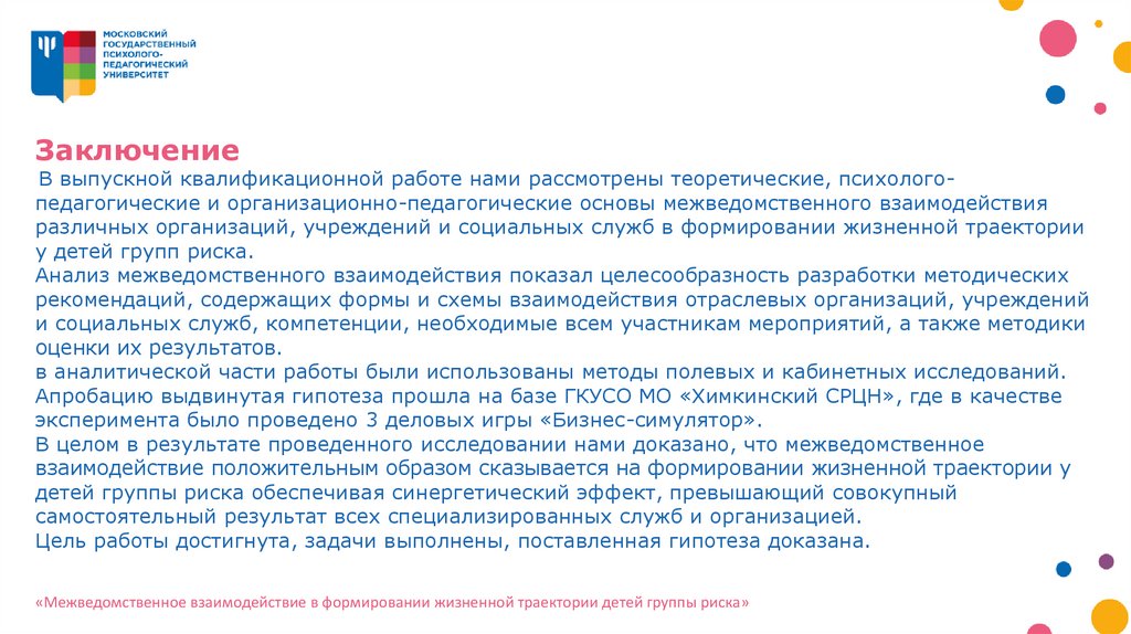 Тема выпускной квалификационной работы: Межведомственное взаимодействие в формировании жизненной