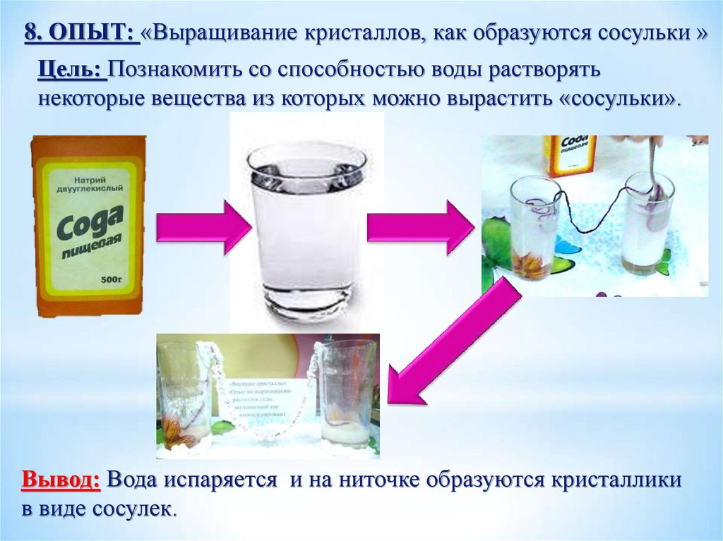 8. ОПЫТ: «Выращивание кристаллов, как образуются сосульки »Цель: Познакомить со способностью воды растворять