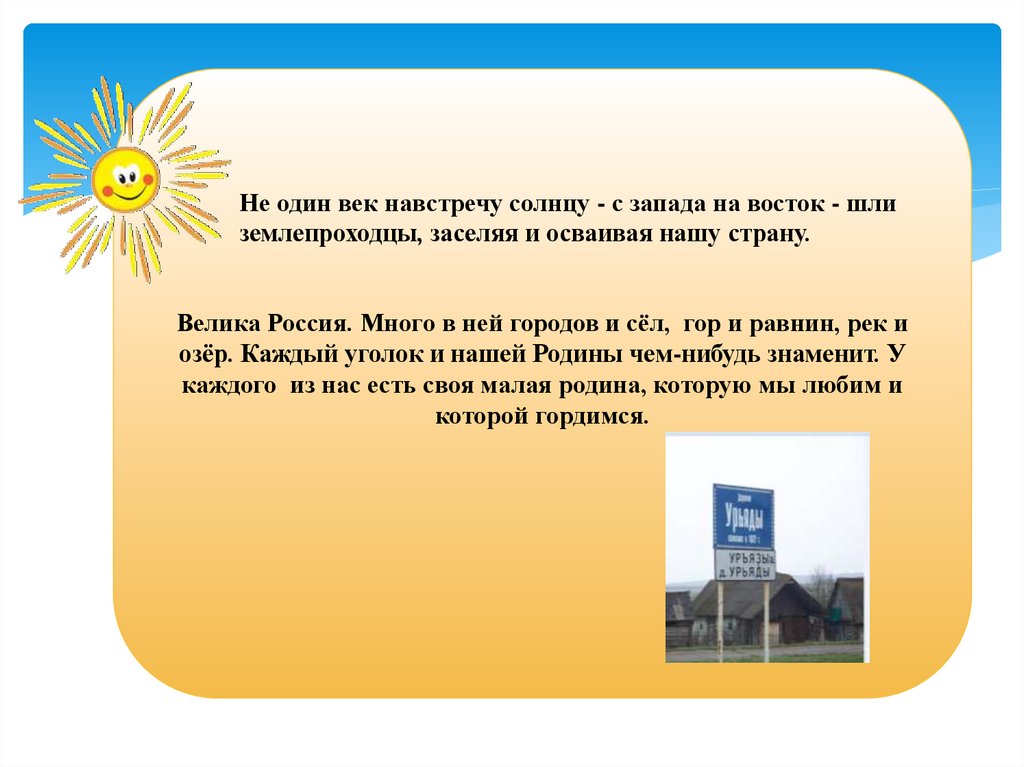 Не один век навстречу солнцу - с запада на восток - шлиземлепроходцы, заселяя и осваивая нашу страну.