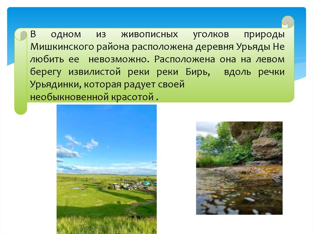В одном из живописных уголков природыМишкинского района расположена деревня Урьяды Не