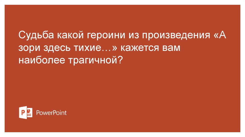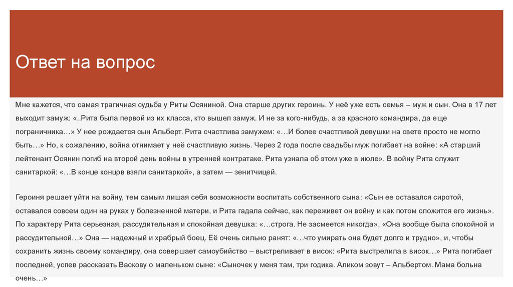 Ответ на вопросМне кажется, что самая трагичная судьба у Риты Осяниной. Она старше других героинь. У неё уже есть семья – муж и сын. Она в 17 лет