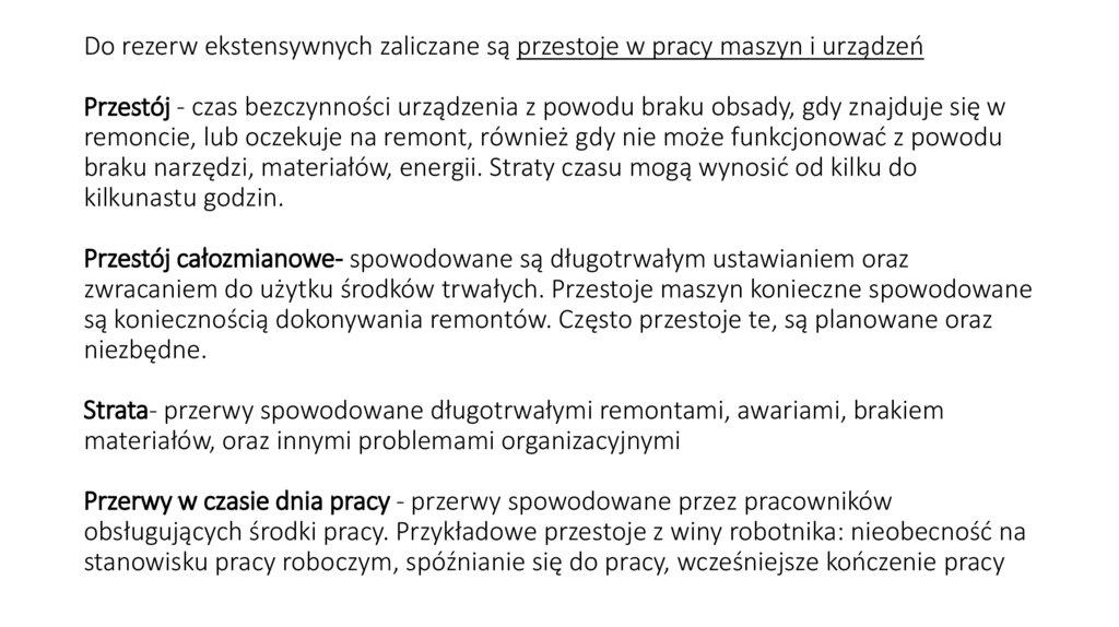 Do rezerw ekstensywnych zaliczane są przestoje w pracy maszyn i urządzeńPrzestój - czas bezczynności urządzenia z powodu braku obsady, gdy znajduje się w