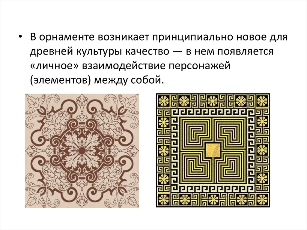 • В орнаменте возникает принципиально новое длядревней культуры качество — в нем появляется