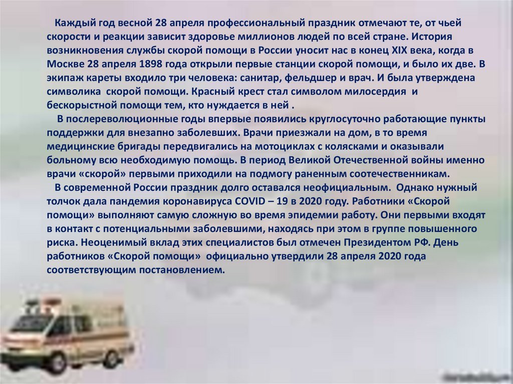 Каждый год весной 28 апреля профессиональный праздник отмечают те, от чьейскорости и реакции зависит здоровье миллионов людей по всей стране. История