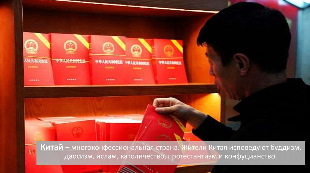 Китай – многоконфессиональная страна. Жители Китая исповедуют буддизм,даосизм, ислам, католичество, протестантизм и конфуцианство.