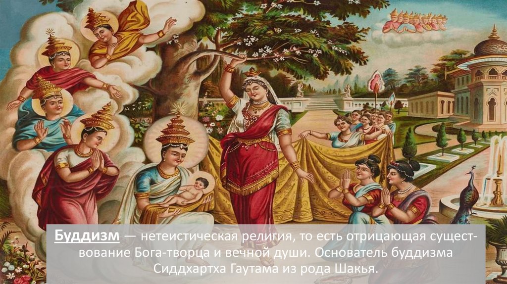 Буддизм — нетеистическая религия, то есть отрицающая существование Бога-творца и вечной души. Основатель буддизмаСиддхартха Гаутама из рода Шакья.