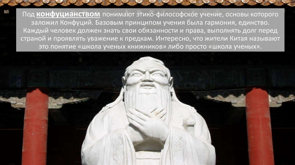 Под конфуцианством понимают этико-философское учение, основы которогозаложил Конфуций. Базовым принципом учения была гармония, единство.
