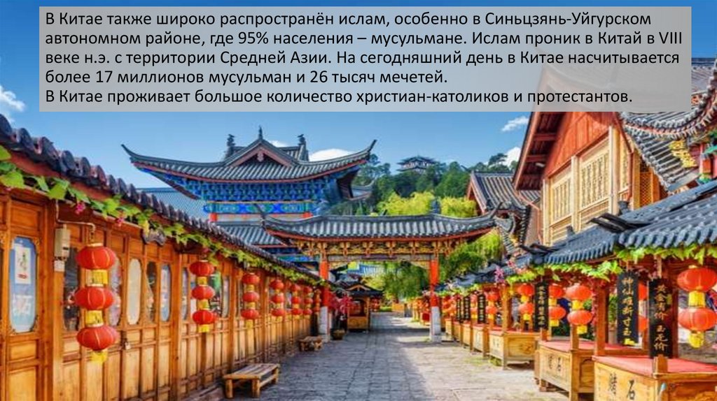 В Китае также широко распространён ислам, особенно в Синьцзянь-Уйгурскомавтономном районе, где 95% населения – мусульмане. Ислам проник в Китай в VIII