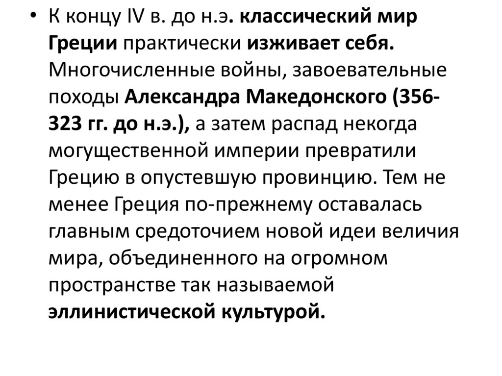 • К концу IV в. до н.э. классический мирГреции практически изживает себя.