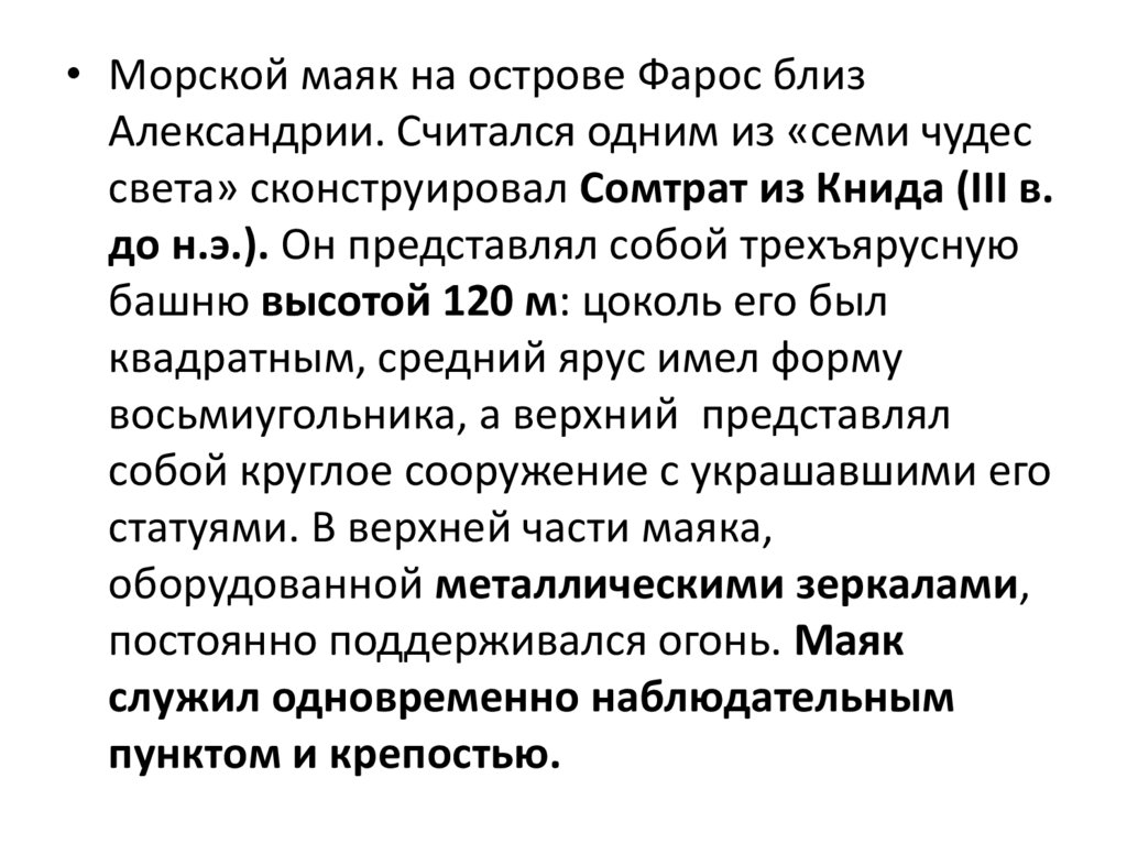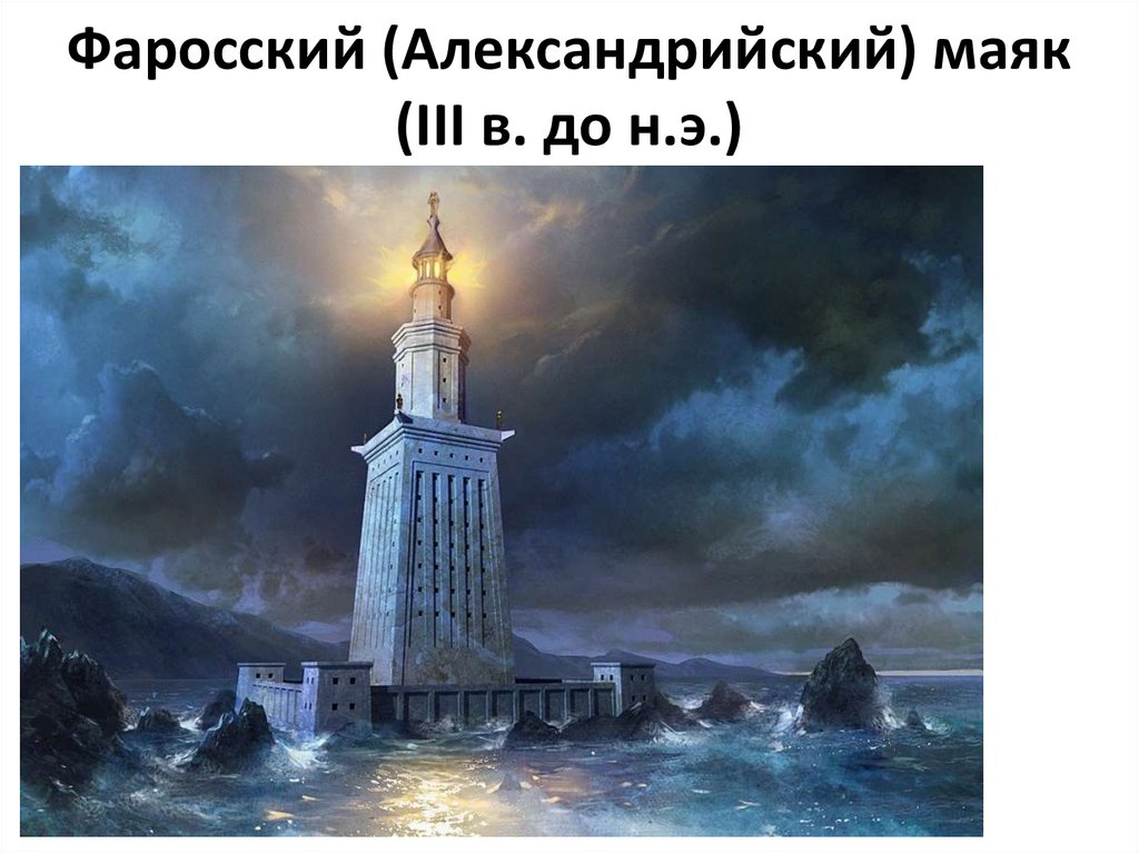 • Морской маяк на острове Фарос близАлександрии. Считался одним из «семи чудес