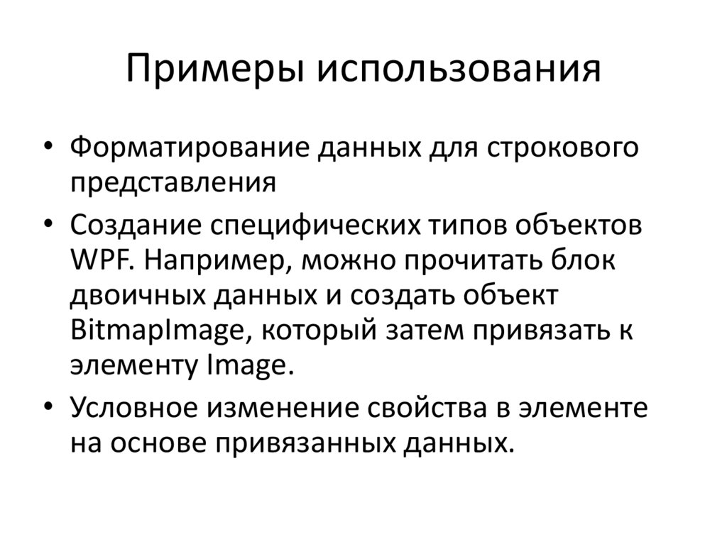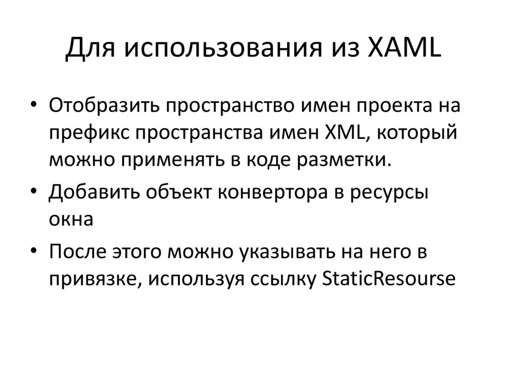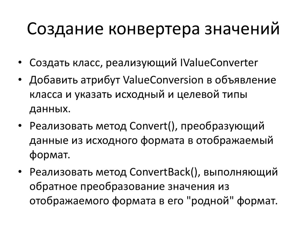 Создание конвертера значений• Создать класс, реализующий IValueConverter