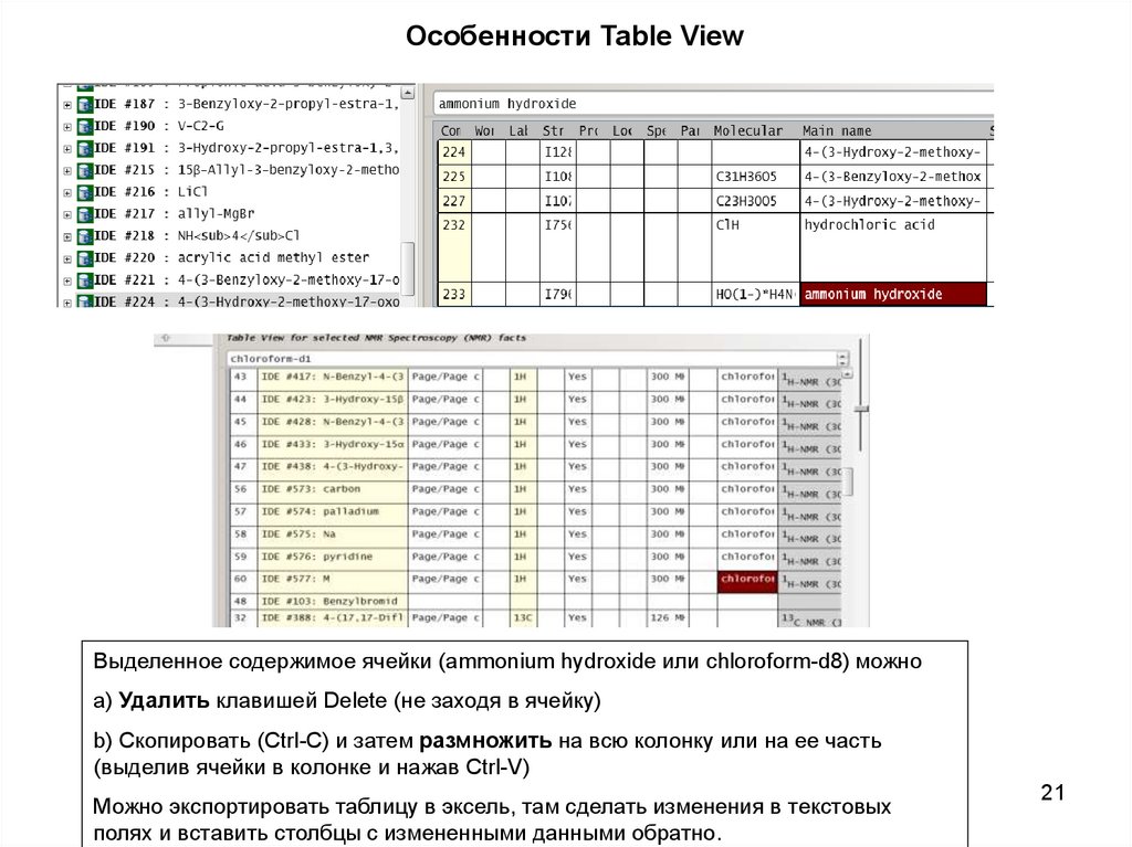 Особенности Table ViewВыделенное содержимое ячейки (ammonium hydroxide или chloroform-d8) можно