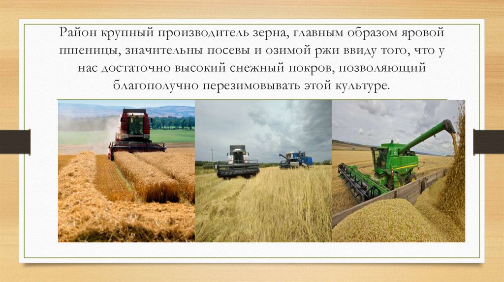 Район крупный производитель зерна, главным образом яровойпшеницы, значительны посевы и озимой ржи ввиду того, что у