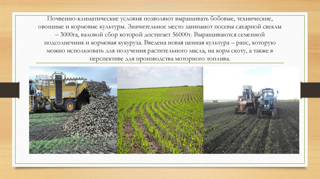 Почвенно-климатические условия позволяют выращивать бобовые, технические,овощные и кормовые культуры. Значительное место занимают посевы сахарной свеклы