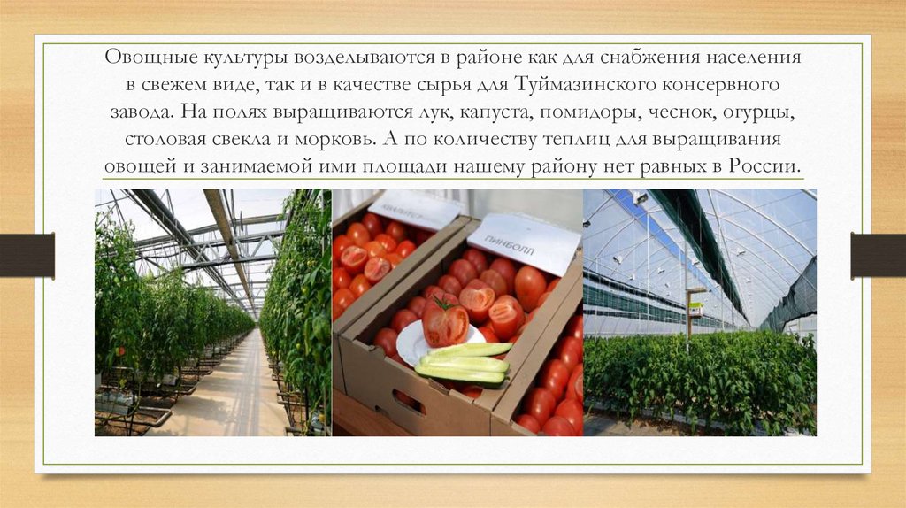 Овощные культуры возделываются в районе как для снабжения населенияв свежем виде, так и в качестве сырья для Туймазинского консервного