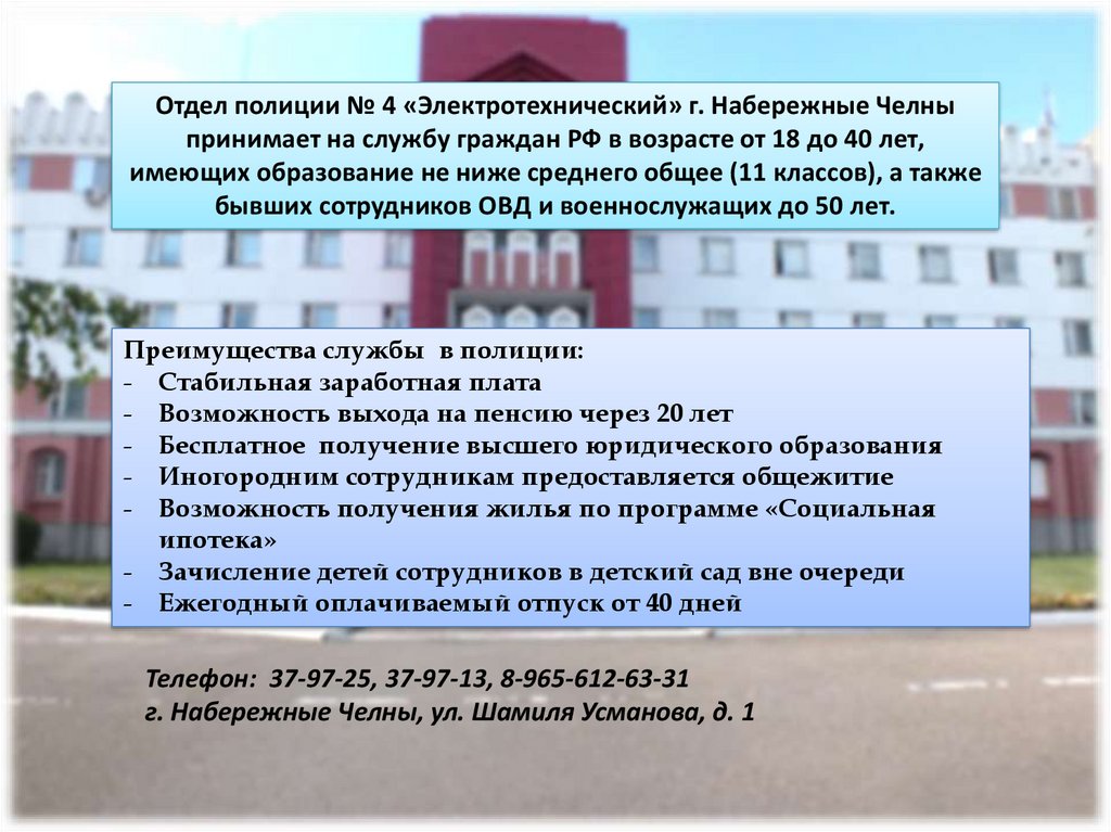Отдел полиции № 4 «Электротехнический» г. Набережные Челныпринимает на службу граждан РФ в возрасте от 18 до 40 лет,
