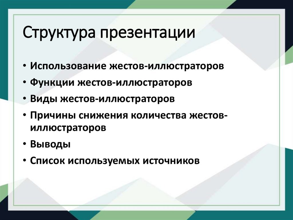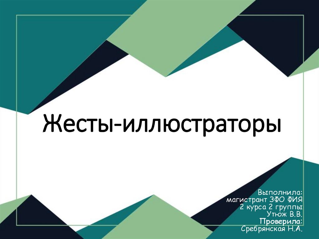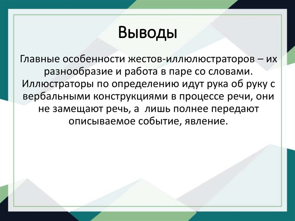 ВыводыГлавные особенности жестов-иллюлюстраторов – их