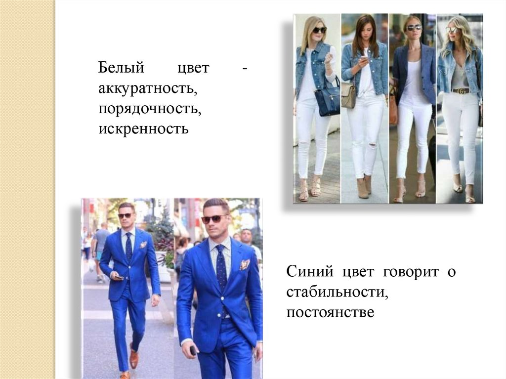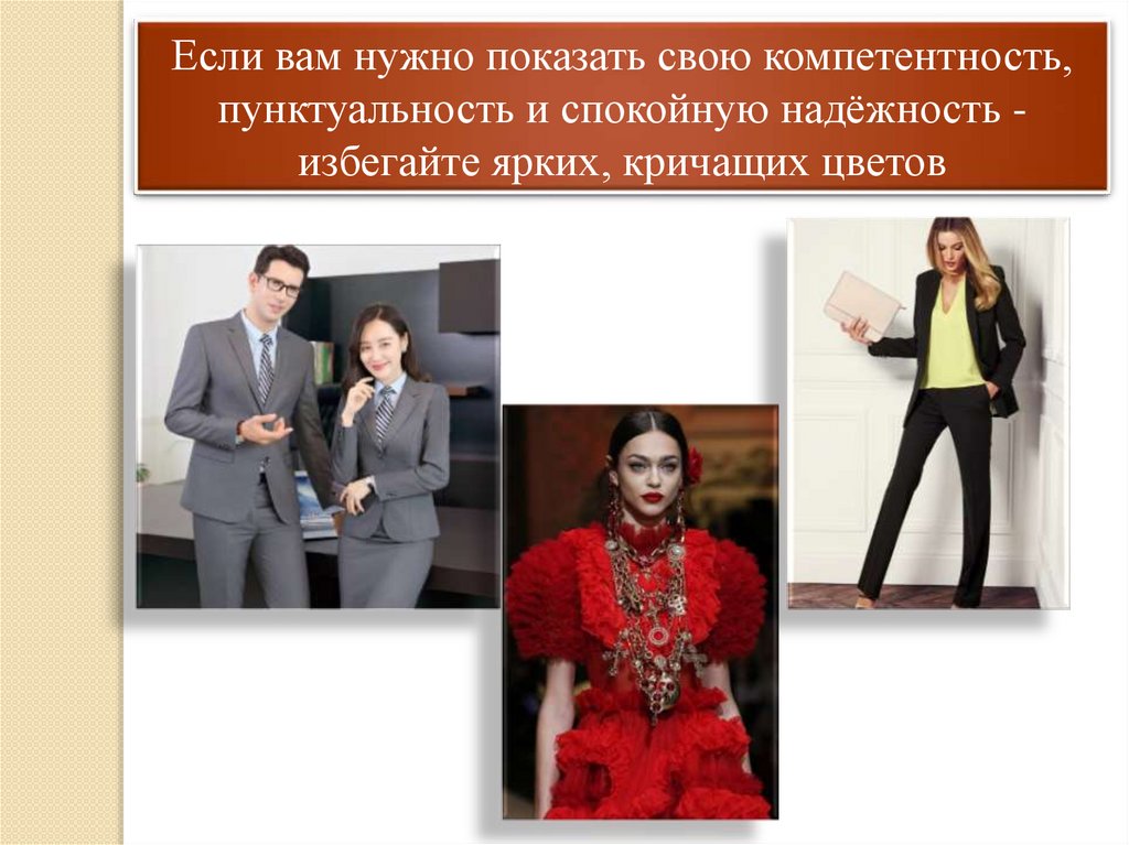 Если вам нужно показать свою компетентность,пунктуальность и спокойную надёжность избегайте ярких, кричащих цветов