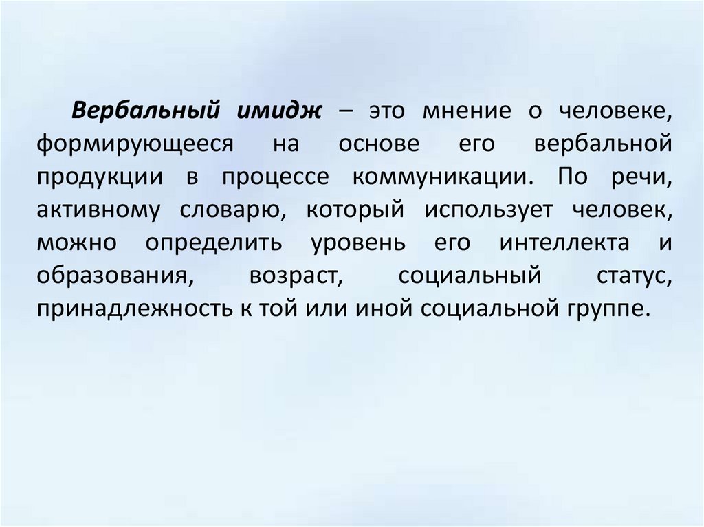 Вербальный имидж – это мнение о человеке,формирующееся на основе его вербальной