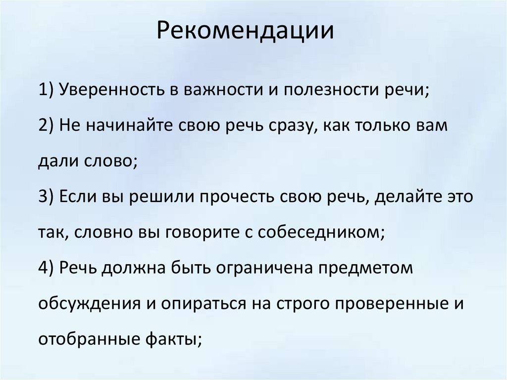 Рекомендации1) Уверенность в важности и полезности речи;